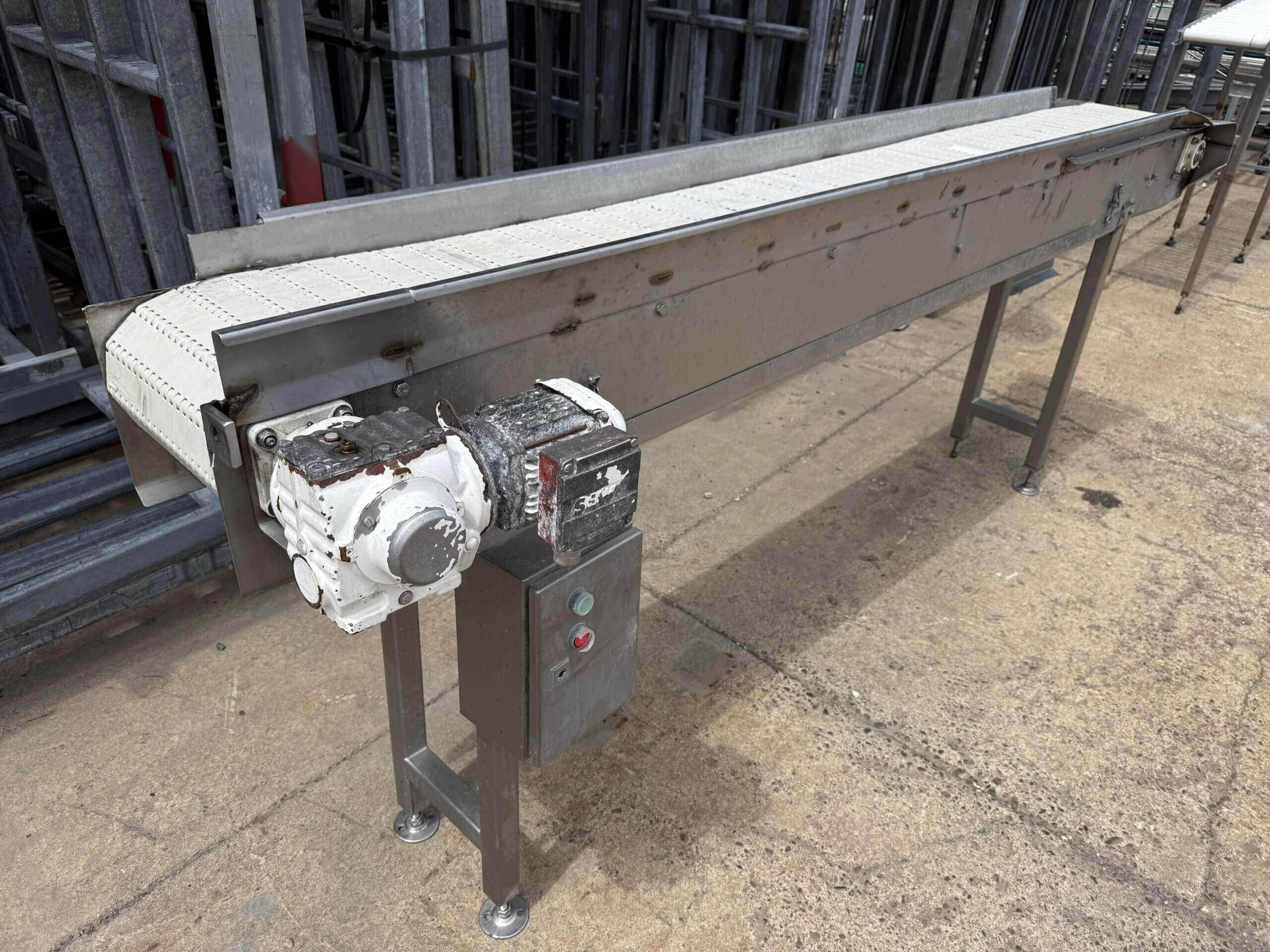 Plastic Intralox Belting. Frame has been a little beat up in areas, call in for a look. Priced accordingly.